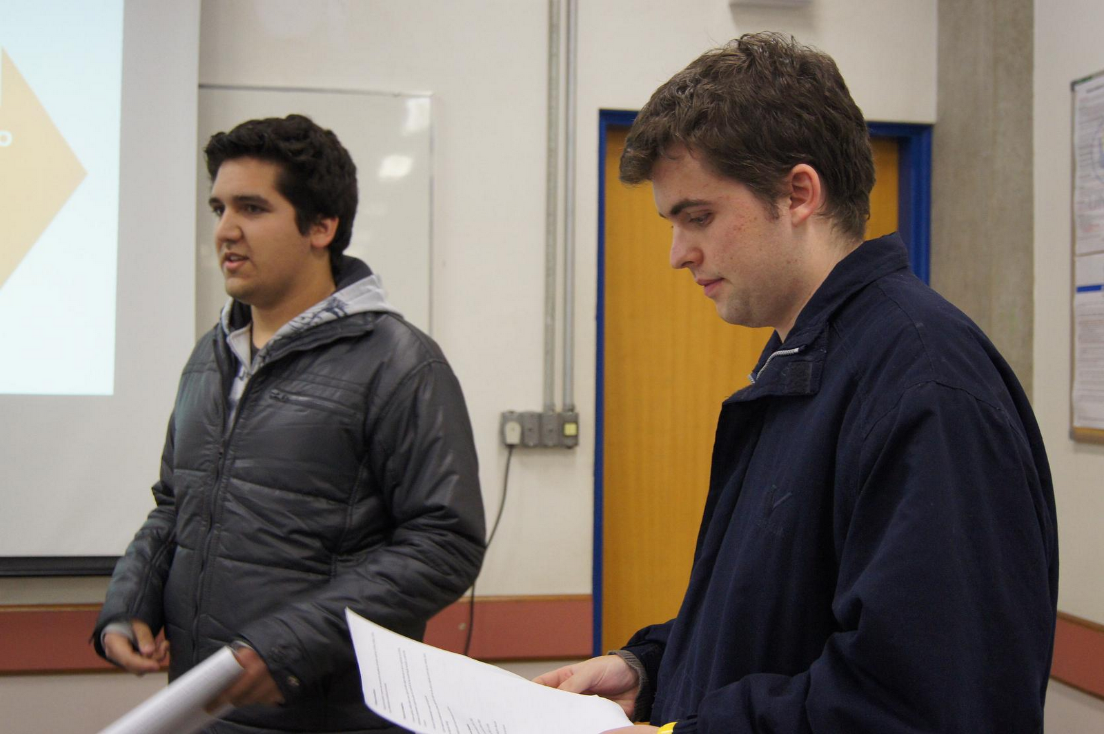 | Os alunos Jomar Bellini e Eric Mantuan durante a apresentação da pré-banca sobre “Jornalismo Literário-Cultural: Um estudo do caderno Mais Cruzeiro”. (Marianna Barreto / AgênciaJor / Uniso) |