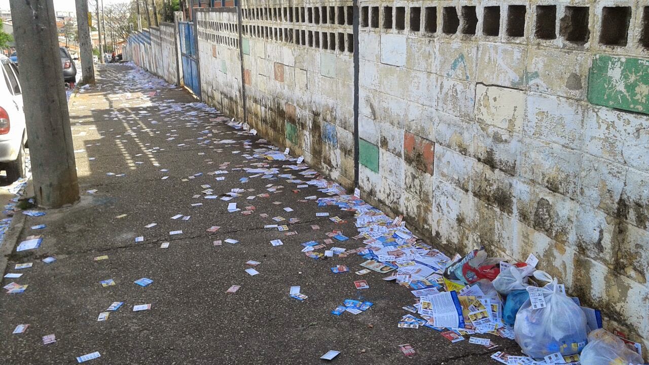 | Escola Estadual José Reginato no Jardim Simus com muito lixo de santinhos, adesivos e até revistas de candidatos na frente da seção eleitoral causa indignação dos eleitores. Foto: Fernando Negrão |