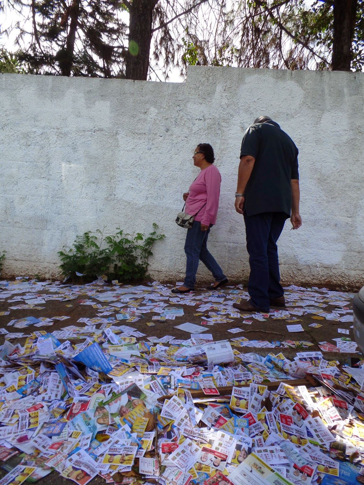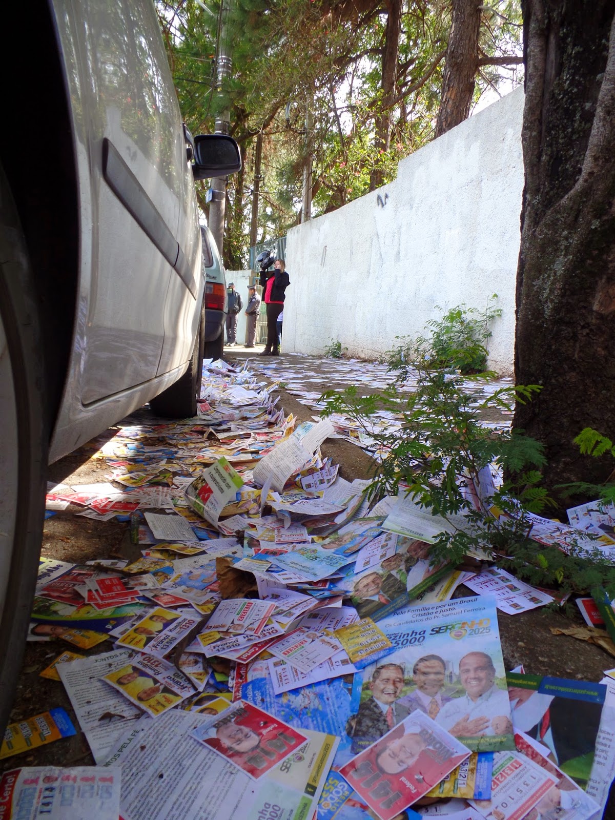 | Escola Estadual José Reginato no Jardim Simus com muito lixo de santinhos, adesivos e até revistas de candidatos na frente da seção eleitoral causa indignação dos eleitores. Foto: Fernando Negrão |