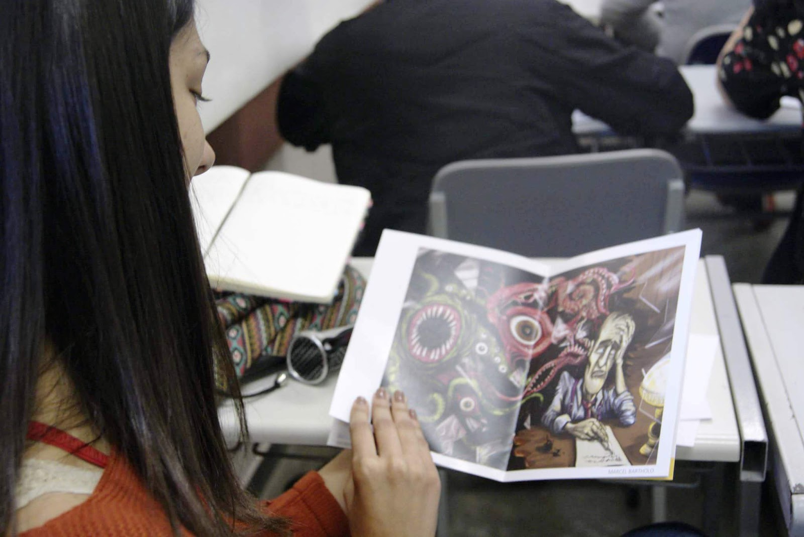A oficina de “Ilustração e Criação de Personagens” com o historiador e ilustrador, Marcel Bartholo, que trabalha com comunicação visual, aconteceu na nesta quarta- feira, 28, na cidade universitária. Desenho cego foi uma das técnicas que o caricaturista utilizou para abordar o tema, rabiscar o papel e depois achar coisas que remetem um ser físico é a finalidade da técnica. Para Marcel, é em cima de rabiscos que as coisas ganham sentido, figuras geométricas, contornos e imagens. Os alunos puderam interagir com seus traçados e receberam atenção a todo o momento para ter coragem e desenhar sem medo, “Vocês já sabem desenhar, nós vamos trabalhar mais isso aqui”, disse Marcel. O evento foi realizado durante a semana da comunicação, com o intuito de dar mais dinamismo e liberdade na hora da criação e incentivar a importância de uma criatividade alinhada a técnicas, através de atividades como desenho abstrato, ilustração de figuras e desenho de observação.