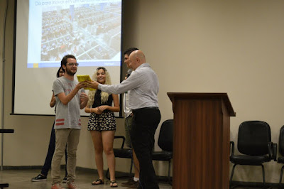 O prêmio sendo entregue ao representante do grupo ganhador