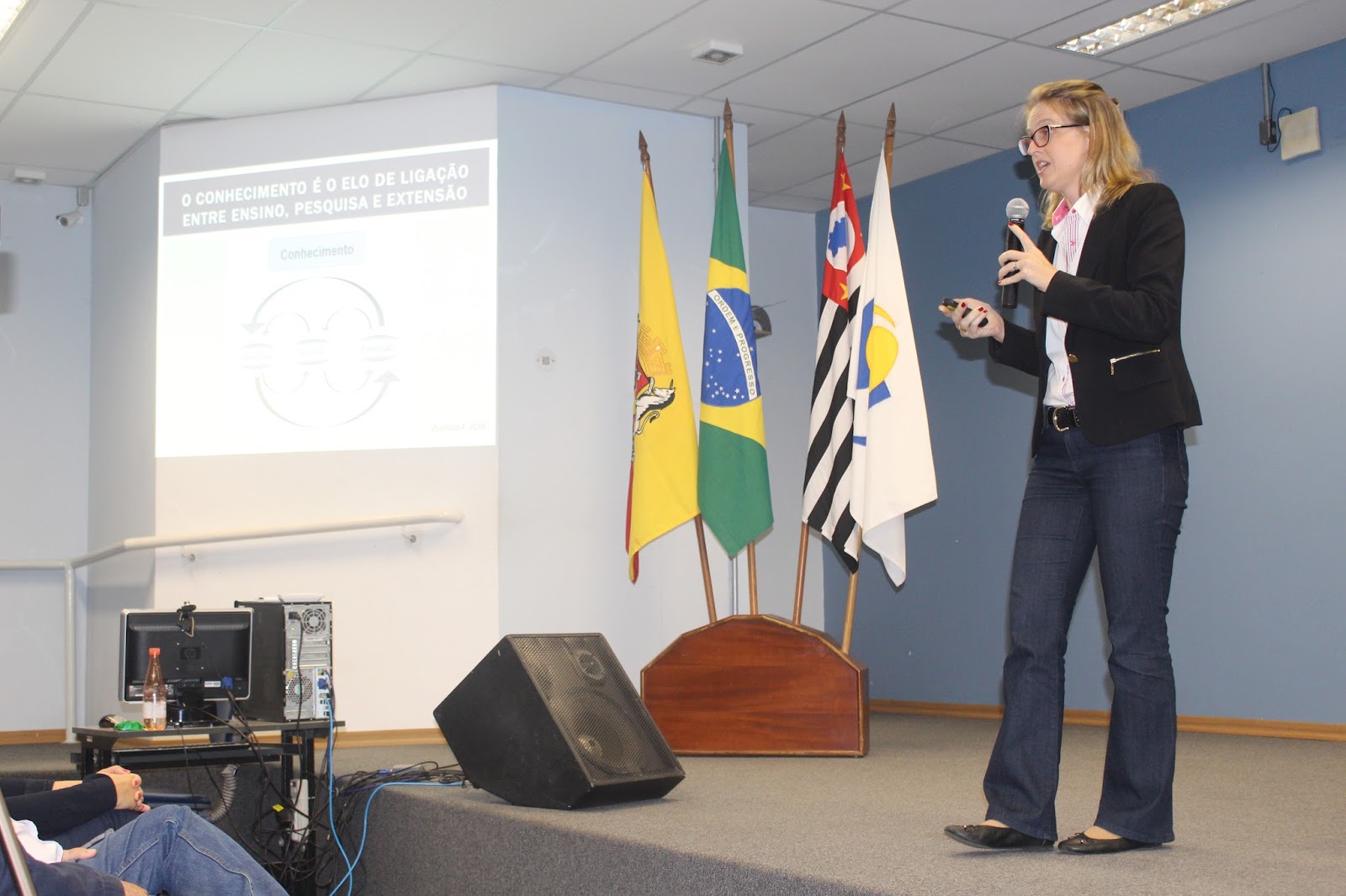 A primeira palestra, “Diálogos do Ensino, Pesquisa e Extensão na Formação Acadêmica e Profissional”, foi ministrada pela professora doutora Kátia De Angelis, que falou sobre a história das universidades e sobre os pilares que contribuem para seu bom funcionamento: Ensino, pesquisa e extensão.