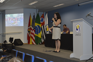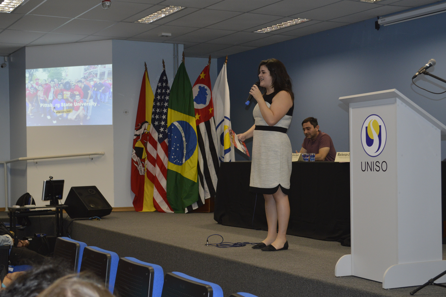 Mackenzie Etchells, representante da Pittsburg State University, visitou a Uniso na manhã de terça-feira, dia 10 de abril, no auditório do bloco F, para contar sobre as oportunidades que a parceria entre as duas universidades oferece para os alunos da Uniso que tiverem interesse de realizar um intercâmbio universitário.