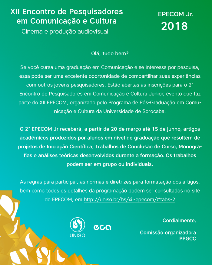 Trabalhos desenvolvidos nos cursos de graduação em Jornalismo, Publicidade e Propaganda, Relações Públicas e Design podem ser inscritos até dia 15 de junho em evento promovido pela Universidade de Sorocaba. Este é o prazo final para os interessados que desejam participar do XII Encontro de Pesquisadores em Comunicação e Cultura (Epecom) e do II Epecom Jr.
