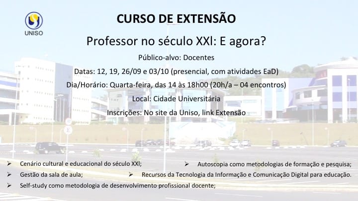 Com o objetivo de preparar os docentes para uma prática pedagógica, o curso de extensão “Professor no século XXI: E agora? ” abordará cinco eixos temáticos como: I – Cenário cultural e educacional do século XXI; II- Gestão da sala de aula; III – Self-Study como metodologia de desenvolvimento profissional docente; IV – Autoscopia como metodologias de formação e pesquisa; e V – Recurso da tecnologia da informação e comunicação digital para educação.