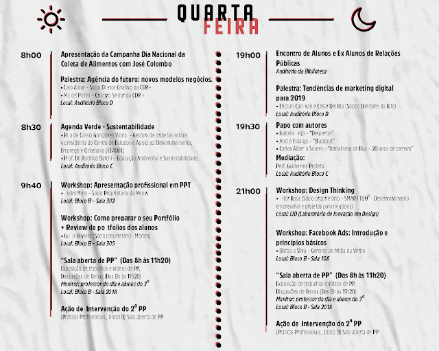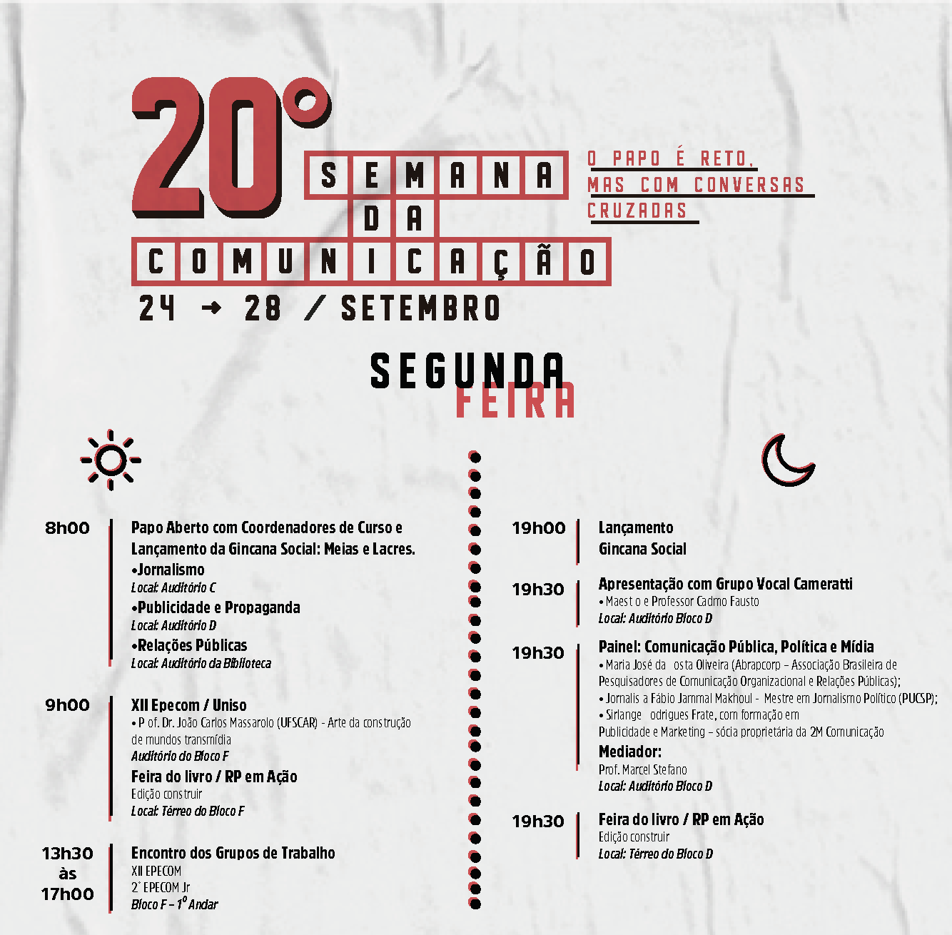 A 20ª Semana da Comunicação começa nessa segunda (24) e ocorre até 28 de setembro, trazendo o tema “O papo é reto, mas com conversas cruzadas” e oferece palestras e workshops para os alunos dos cursos de Jornalismo, Publicidade e Propagando e Relações Públicas.