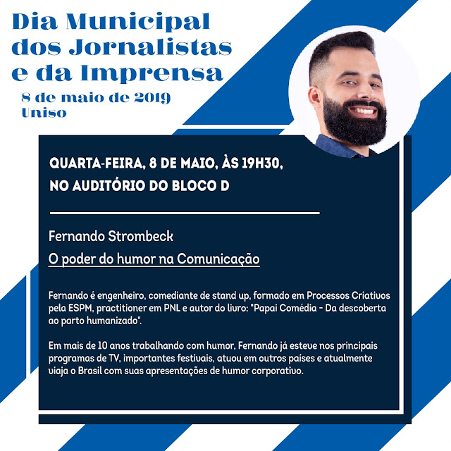 O Curso de Jornalismo recebe, na próxima quarta-feira, dia 8, às 19h30, o comediante de stand up Fernando Strombeck que apresenta a palestra “O poder do humor na Comunicação”. O evento marca o Dia Municipal do Profissional em Jornalismo e da Imprensa, e acontece no Auditório do Bloco D, na Cidade Universitária Prof. Aldo Vannucchi, aberto ao público.