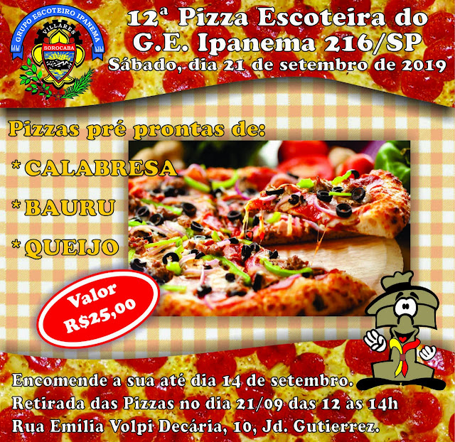 O Grupo de Escoteiros Ipanema, em Sorocaba desde 1992, está promovendo a venda de pizzas pré-montadas, nos sabores calabresa, bauru e queijo, até o dia 14 de setembro. As pizzas custarão 25 reais e poderão ser encomendadas diretamente na sede do grupo, com retirada programada para o dia 21 de setembro, das 12h às 14h, na rua Emilia Volpir Decária, 10, Jardim Gutierrez.