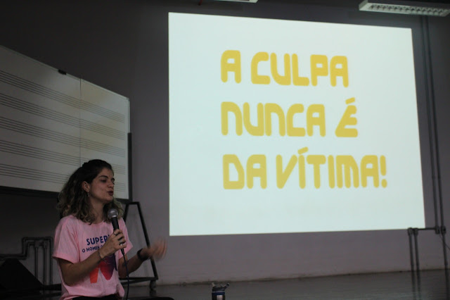 Além das explicações, foram exibidos alguns exemplos de propagandas e reportagens sexistas. Garcia extraiu manchetes de casos de estupro e feminicídios que mostraram, de forma nítida, uma tentativa em justificar e/ou culpabilizar as mulheres. “A culpa nunca é da vítima”, afirmou em um dos slides de apresentação.