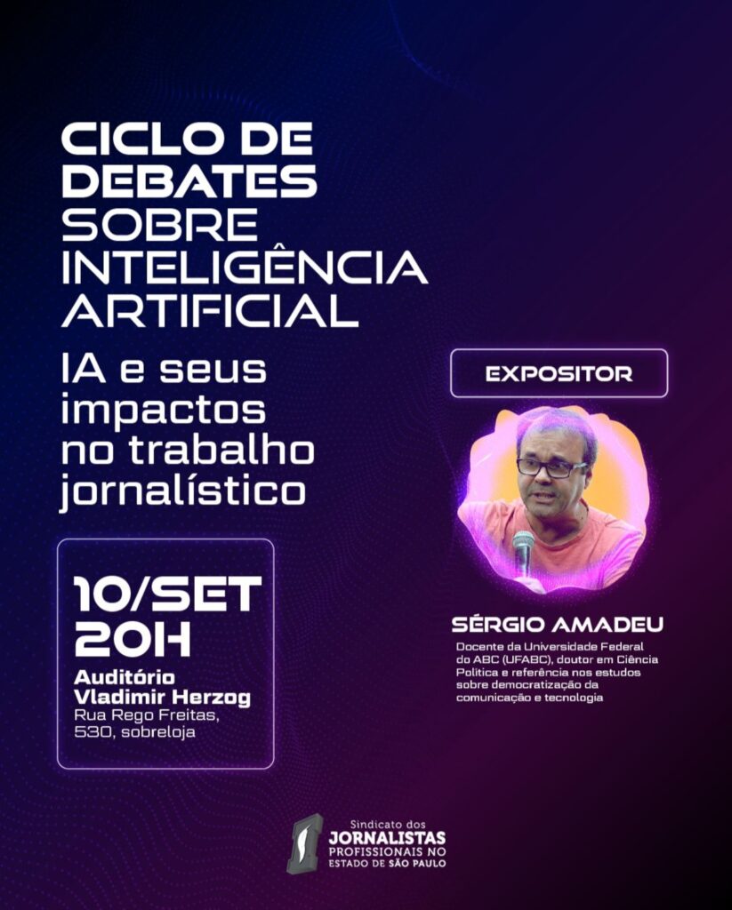 Sindicato dos Jornalistas inicia ciclo de debates sobre Inteligência Artificial com exposição de Sérgio Amadeu (UFABC): encontro acontece na próxima semana, quarta-feira (10), as 20h