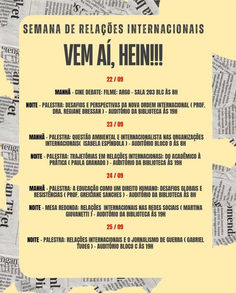 A semana de palestras do curso de Relações Internacionais (RI) acontece na Uniso, no campus da cidade universitária, entre os dias 22 e 25 de setembro. O evento é organizado pela coordenação de RI, juntamente com o centro acadêmico do curso e os grupos de estudos PIMA (Política Internacional e Meio Ambiente) e GEOMU (Grupo de Estudos do Oriente Médio).