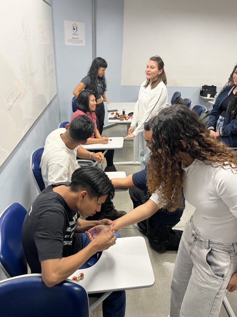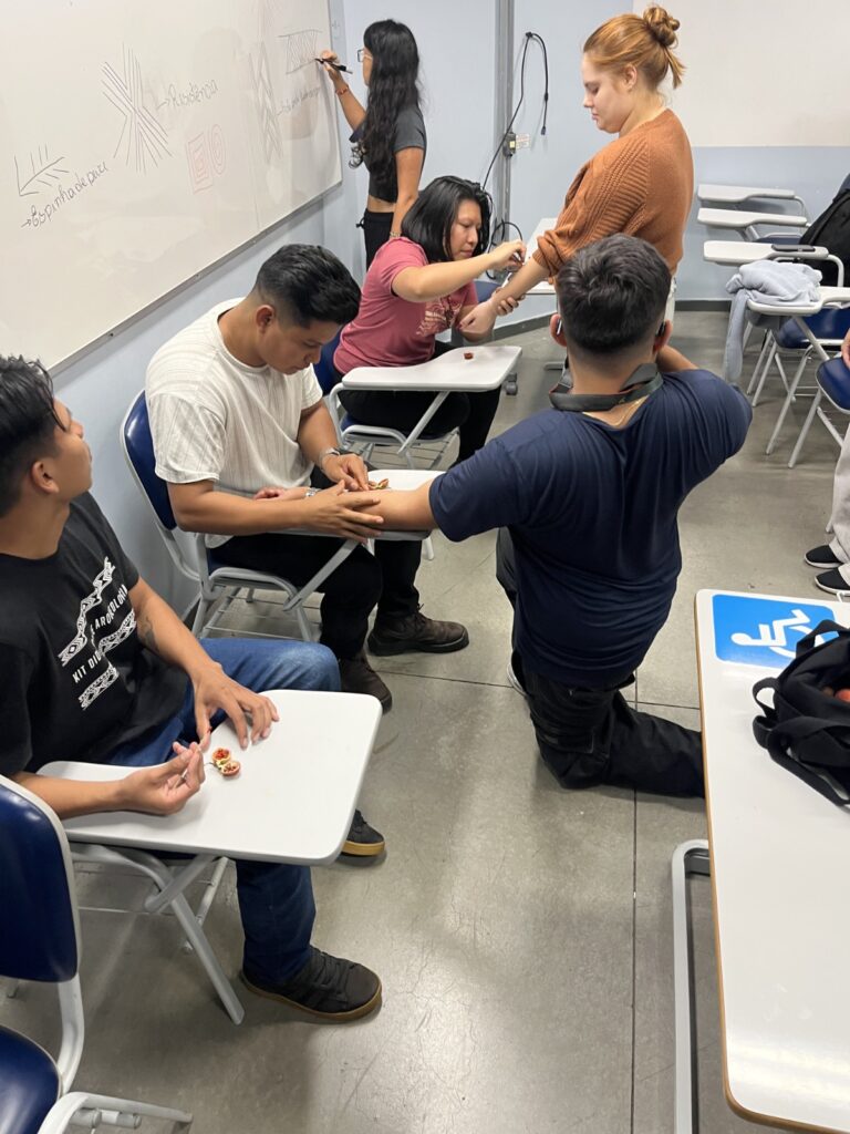 Após a roda de conversa, os estudantes seguiram para a sala 113 do bloco F para realizar uma oficina sobre Grafismos Indígenas, ministrada pelos convidados do CCI-UFSCAR.