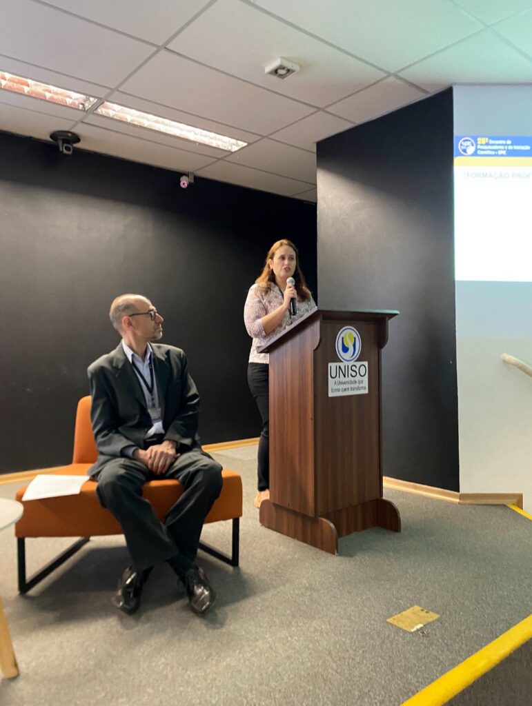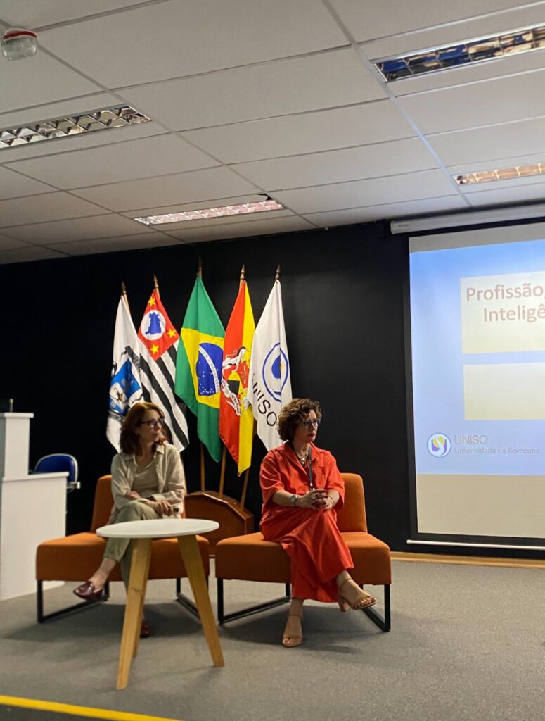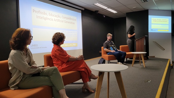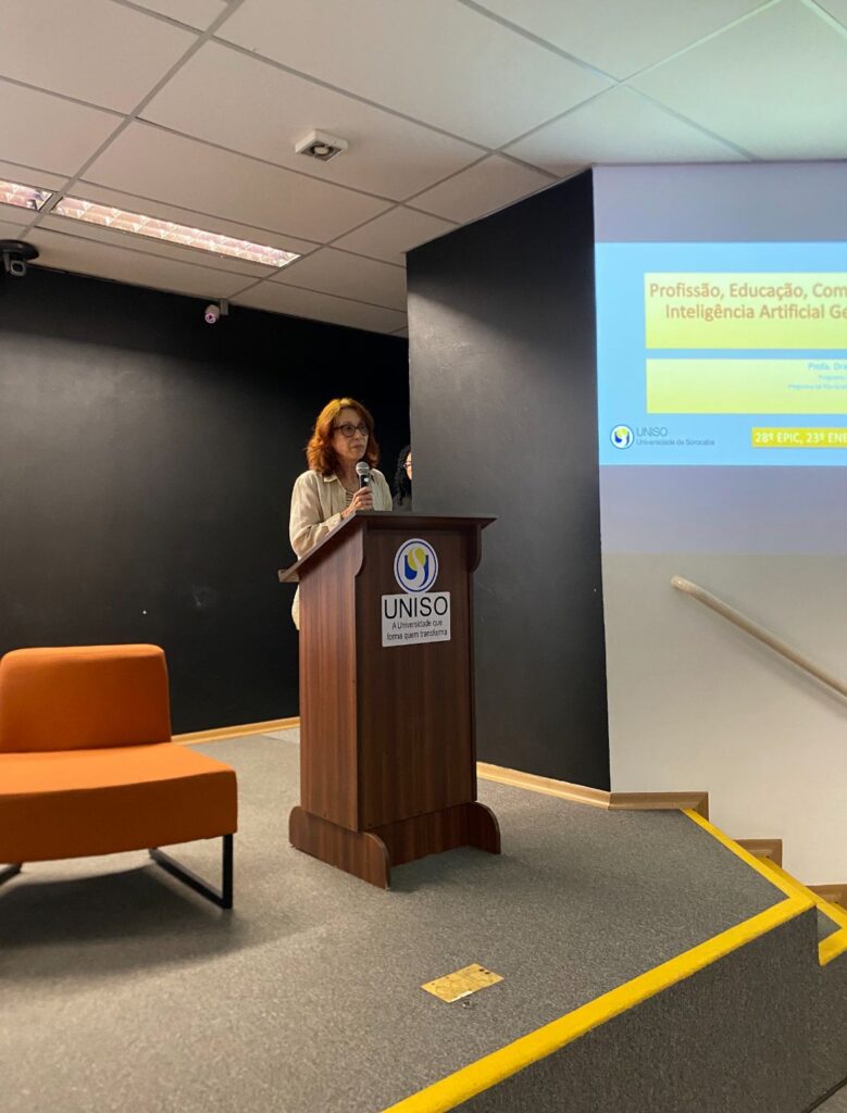 “Antes de começar, gostaria de dizer que ninguém é obrigado a concordar com tudo, estamos aqui para discutir ideias”, afirmou Maria Alzira, que trouxe falas sobre seu trabalho de pesquisa intitulado “Profissão, Educação, Competência e Inteligência Artificial Generativa”.