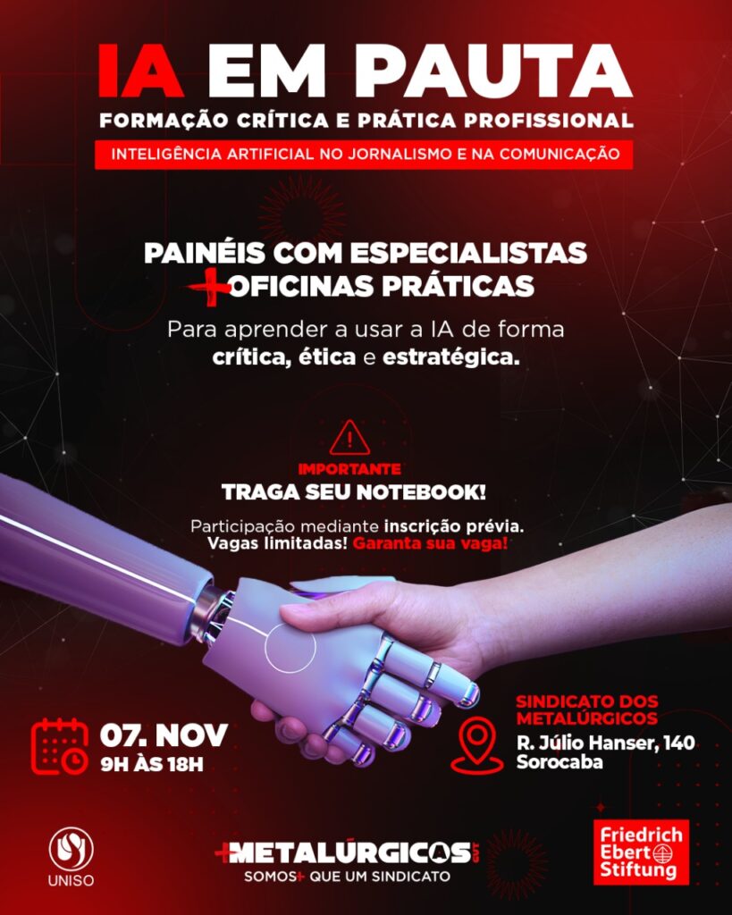 O evento organizado pelo Sindicato dos Metalúrgicos (SMetal) em parceria com o curso de Jornalismo da Universidade de Sorocaba (Uniso) e a Fundação Friedrich Ebert tem como objetivo ensinar aos alunos o uso ético e estratégico da inteligência artificial na comunicação social e, mais especificamente, no jornalismo.