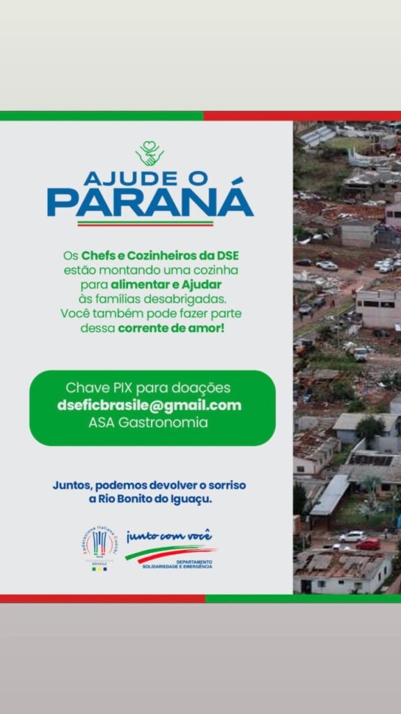 Diante do cenário de emergência, o DSE da Federação Italiana de Cozinheiros anunciou o envio de recursos e voluntários para apoiar o preparo de alimentos e a criação de uma cozinha comunitária em parceria com um restaurante no início da cidade. Uma equipe da cidade de São Paulo foi formada nesta segunda-feira (10/11) e partiu de São Roque para o Paraná durante a madrugada. Os voluntários já se encontram no local, atuando na produção e distribuição de marmitas.