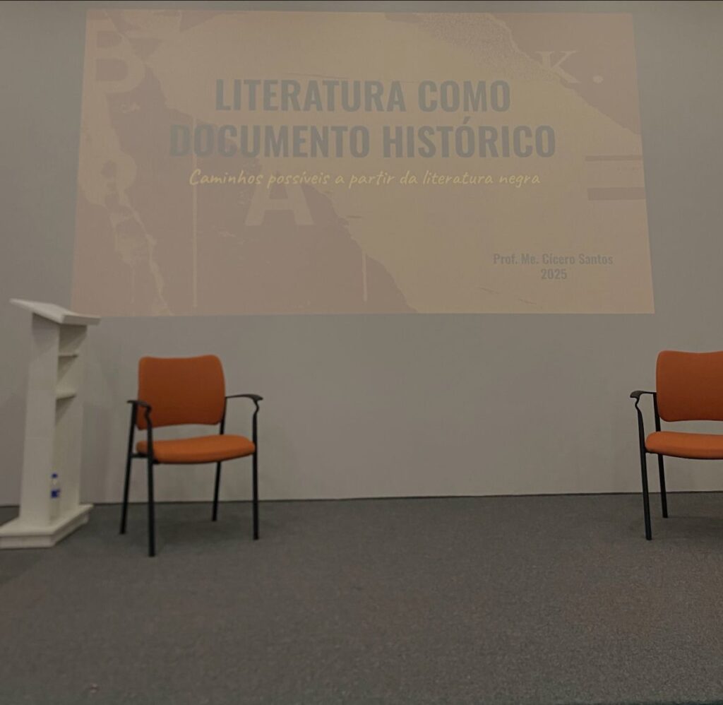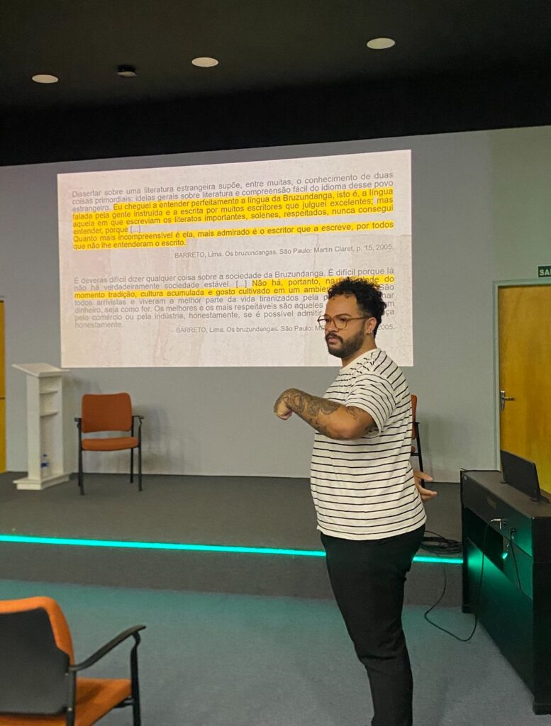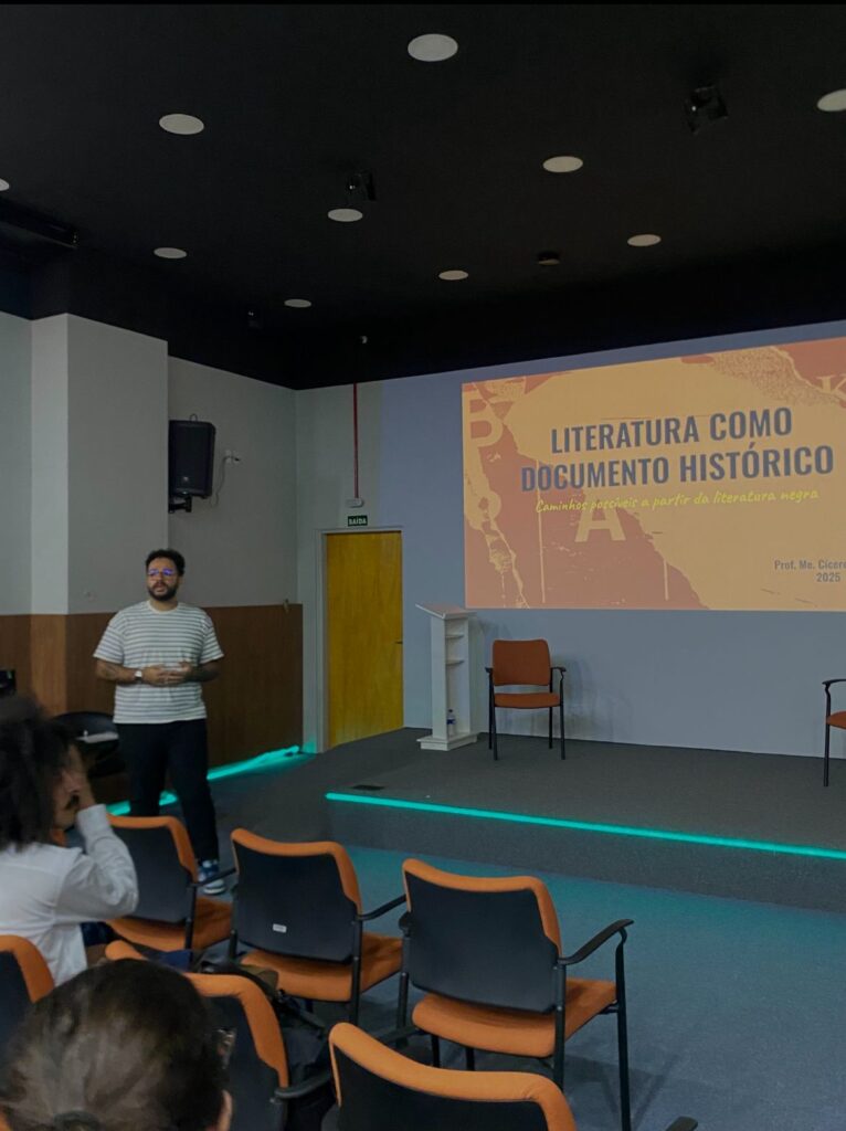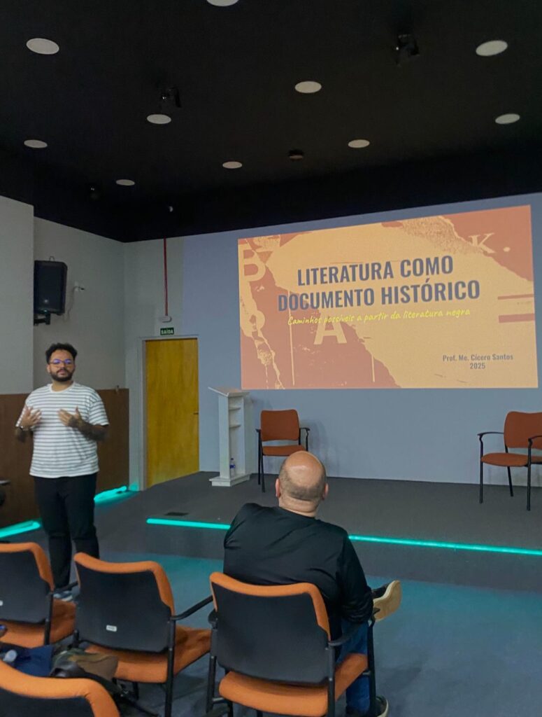 Cícero Santos – graduado em Letras: Português e Inglês pela Uniso, em 2018, e mestre em Letras pelo Programa de Pós-graduação em Estudos Comparados de Literatura de Língua Portuguesa da Universidade de São Paulo – palestrou, no início da noite, sobre “A arte como documento da história: Literatura como documento histórico”. O professor promoveu reflexões sobre como a literatura pode documentar a história de um período, a partir de obras como livros e crônicas voltados à crítica social. Santos comenta que essa produção era mal vista pela elite da sociedade brasileira.