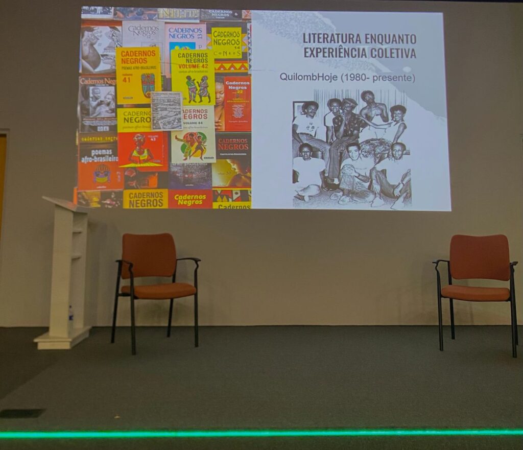 Santos salientou a necessidade de considerar a biografia desses autores em seus contextos e momentos históricos. Ele também trouxe um nome atual para compor sua reflexão; Ana Maria Gonçalves, nascida em 1970 na cidade de Ibiá, interior de Minas Gerais, e a primeira mulher negra a ocupar uma cadeira na Academia Brasileira de Letras. O livro mais conhecido da autora é “Um defeito de cor”. A história se desenrola pela perspectiva da pesquisadora Ana Maria Gonçalves, em visita à Bahia, quando ela encontra documentos muito antigos sobre a mãe de Luís Gama. A autora confabula, em sua narrativa, um passado-presente e imagina um futuro possível, já que em realidade tais documentos não existem.