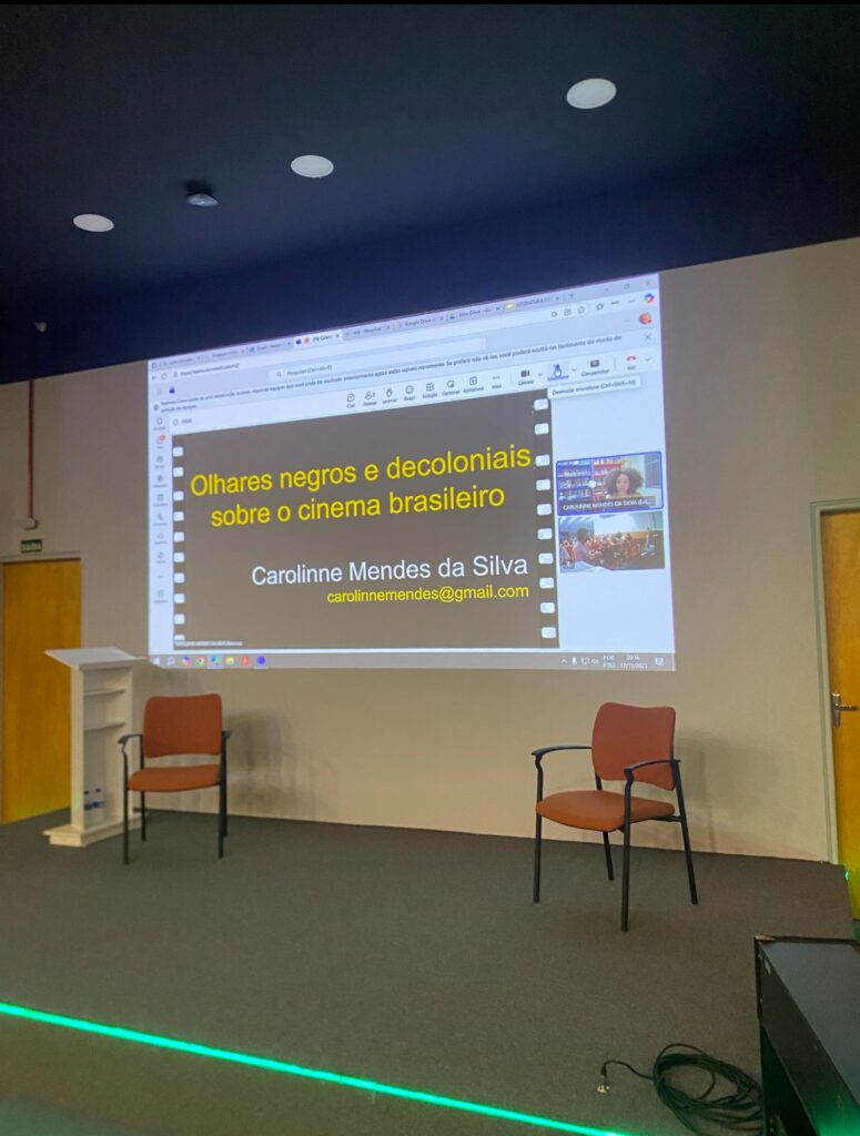 A segunda palestra da noite foi “Olhares negros e descoloniais sobre o cinema brasileiro” ministrada pela professora de história Caroline Mendes da Silva. O foco da palestra foi o cinema como disputa de narrativas de acontecimentos históricos. Silva, que é mestre e doutora em História Social pela Faculdade de Filosofia, Letras e Ciências Humanas da USP, alerta para como o cinema interfere na forma como criamos um imaginário sobre a história porque é por meio das narrativas cinematográficas que acessamos alguns acontecimentos do passado. Nesse sentido, olhar para quem domina a indústria do cinema é importante, afinal a maior parte dos diretores, roteiristas e atores com destaque é formada por homens brancos.