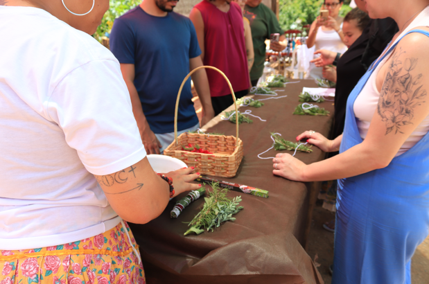 Na oficina de ervas, aprendemos a importância da seleção, limpeza e preparo das ervas. Fizemos um incenso natural, que na visão de Cintia não é “terceirizado” como ocorre com o industrializado que costumamos deixar lá parado, queimando. O natural, temos que reacender o tempo todo e andar com ele pela casa para o ato de purificação.