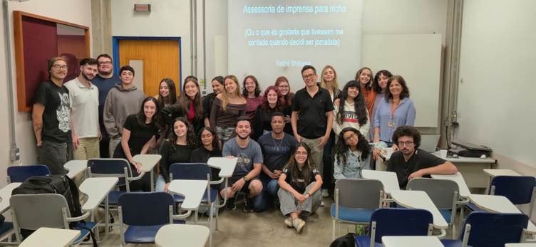 O jornalista Felipe Shikama, em palestra sobre assessoria de imprensa para nichos, apresentou aos estudantes do 5º semestre de Jornalismo da Universidade de Sorocaba (Uniso) caminhos possíveis de atuação profissional e reflexões sobre carreira na área. O encontro foi realizado na última segunda-feira (27), durante a disciplina ministrada pela professora Mônica Cristina Ribeiro Gomes.